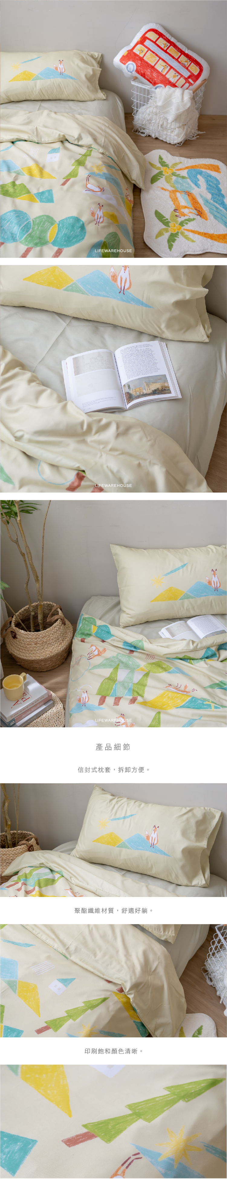 單人尺寸內含物 : 薄被套一組、床包一組、枕套一個。