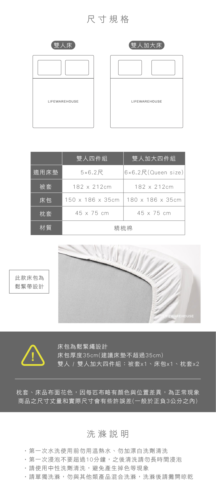 雙人加大尺寸內含物 : 薄被套一組、床包一組、枕套兩個。